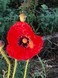 The brilliant morning sun shines on this red poppy and her bee visitor.