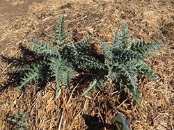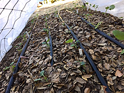 In the garden seedlings pop up through the mulch around irrigation tape.