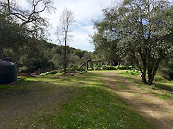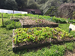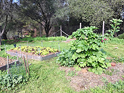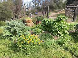 The garden area nearest the upper parking lot is dense and green. The artichoke plant, visible just behind the yellow flowers, came up on its own. It was not planted. Somehow a seed from one of the other two artichoke plants in the garden got clear across to the opposite side of the garden and grew into a healthy specimen.
