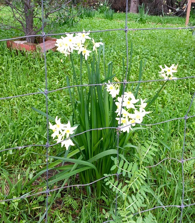 A Narcissus, with its sweetly fragrant white flowers, grows outside the garden fence.