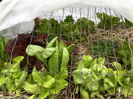 A peek under the cloth protecting plants from winter weather reveals a variety of healthy lettuce plants.